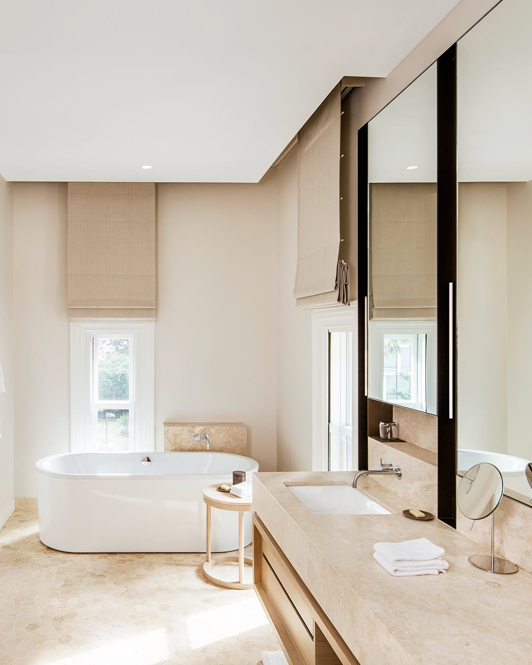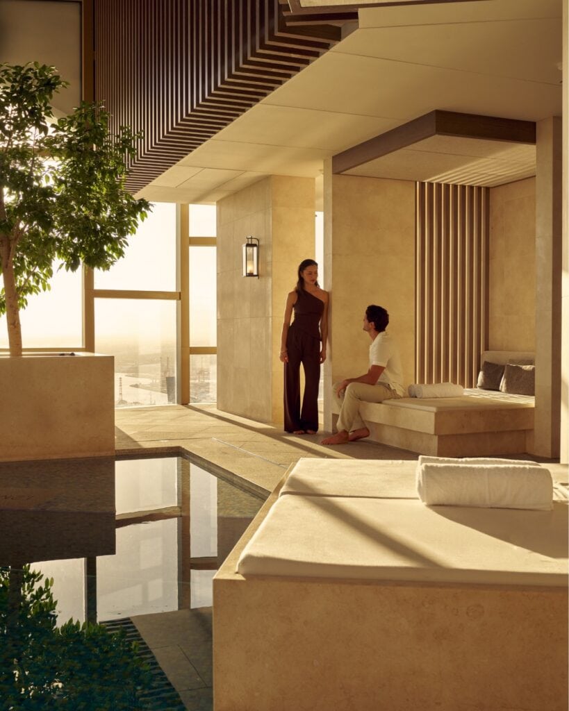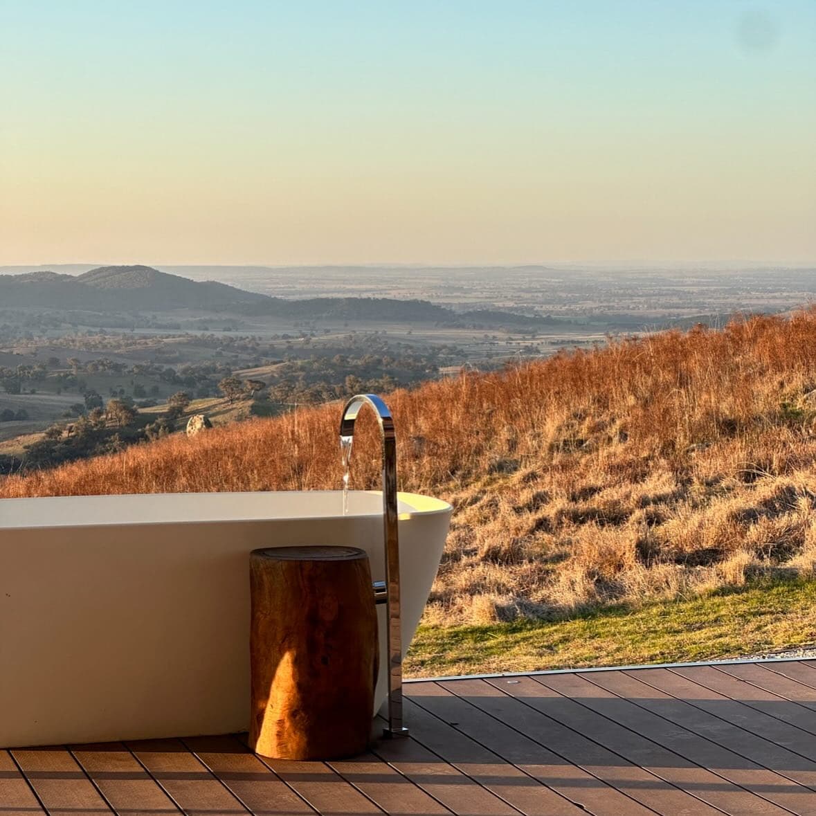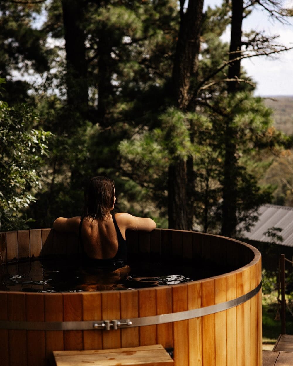 A deep two-person tub calls for a long soak, Aesop products within reach. Outside, two jetty platforms offer quiet spots to sit, sip, and take it all in.