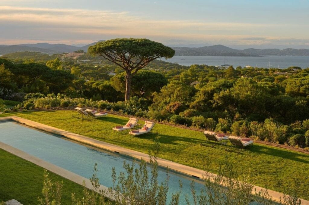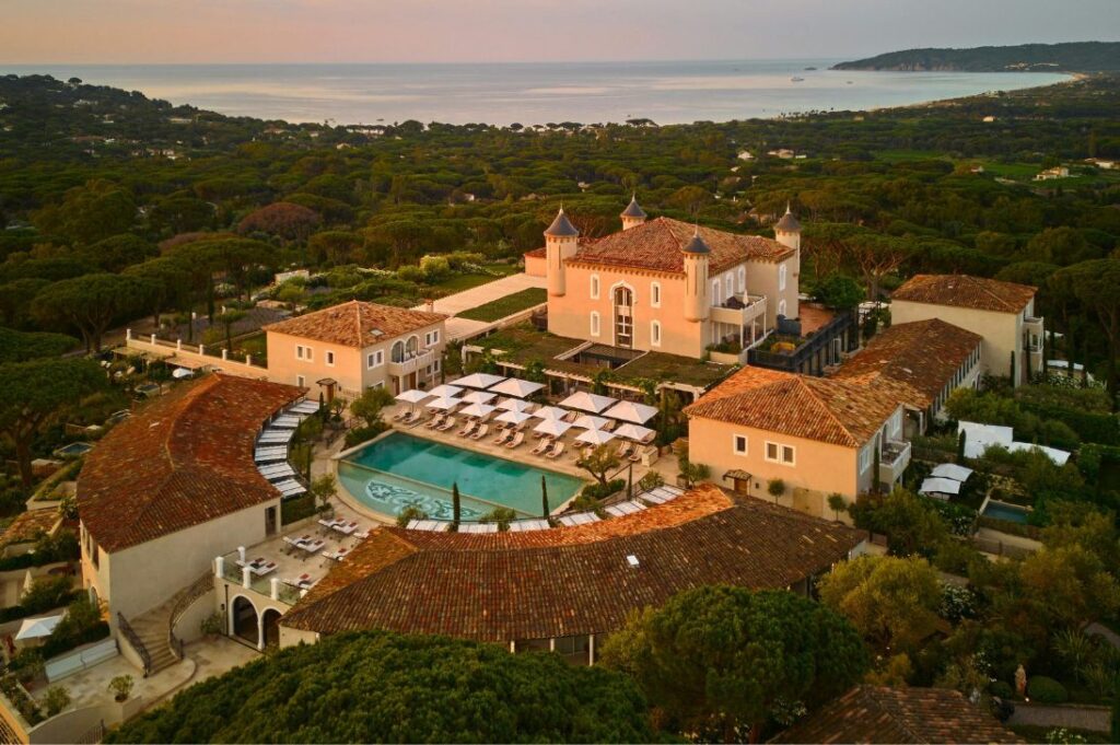 Today, the property’s 86 rooms and suites feature private terraces, some with pools, and sweeping views of the gardens or the Bay of Pampelonne. Guests can float between a panoramic terrace pool, a quiet lap pool tucked among greenery, and an indoor spa pool at the Airelles Spa by Valmont, complete with hammam, sauna, fitness spaces, and pine-fringed yoga lawns. A short chauffeured ride in a Mini‑Moke or Rolls‑Royce takes you to the château’s private beach club at Jardin Tropézina, where sun loungers, umbrellas, and Mediterranean dining await.