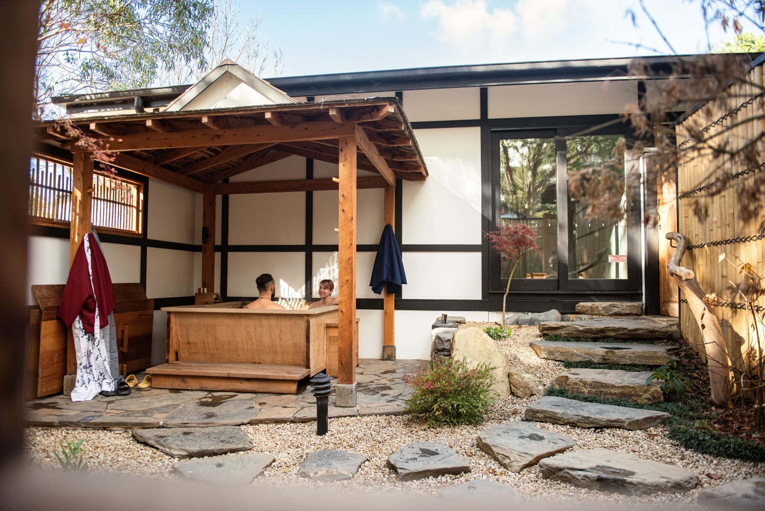You might like to begin your day with a continental breakfast board at The Argus, then drive to Shizuka Ryokan, a Japanese-inspired retreat set among four acres of bushland. Traditional design elements — tatami floors, shoji screens, private courtyards — create a peaceful atmosphere. Your bathing ritual begins in a cedar wash room before you step into a deep hinoki timber bath filled with warm, magnesium-rich water. A shiatsu massage completes the experience.