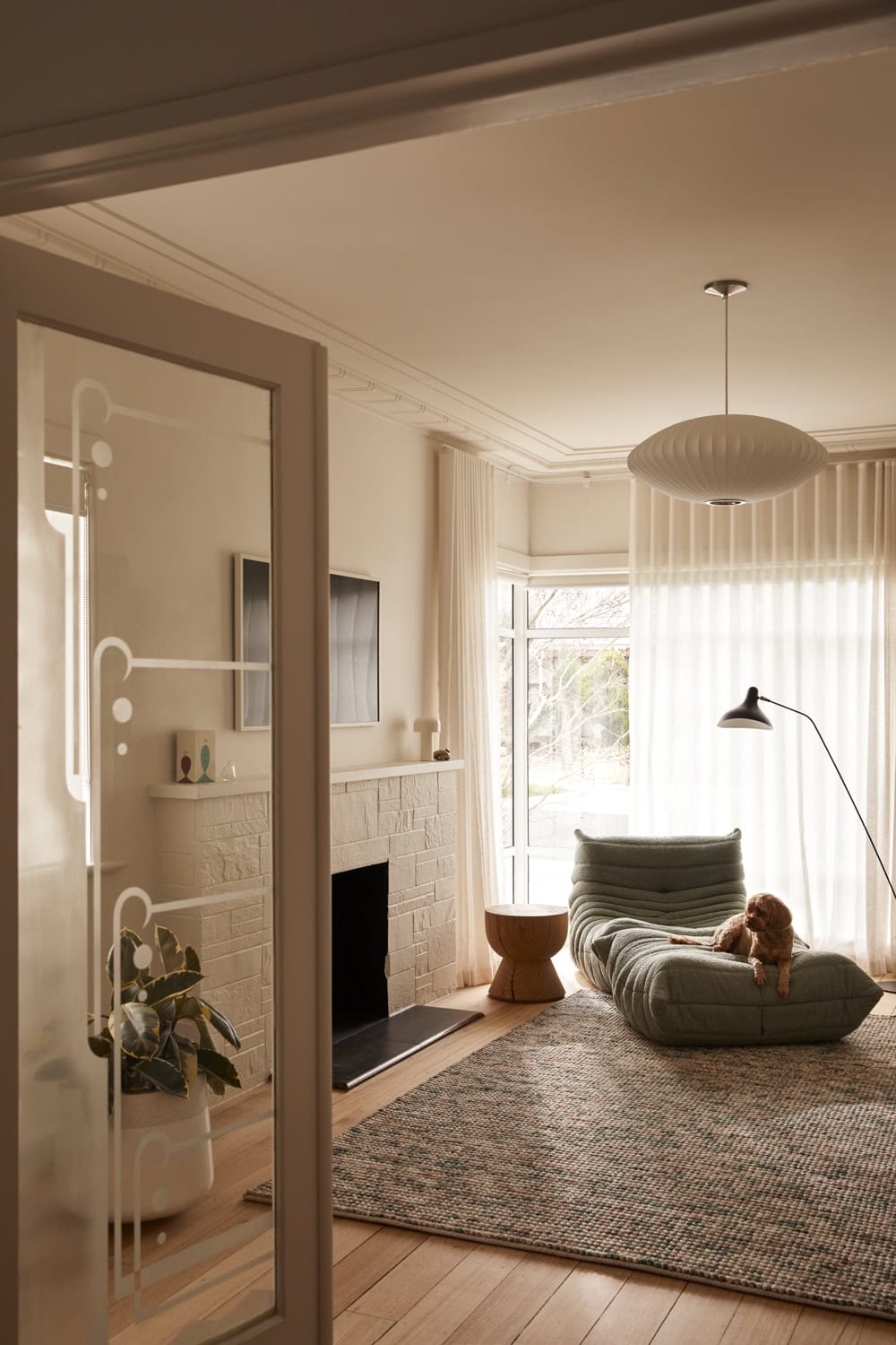 By closing off the connection from the grand front lounge room to the former kitchen and dining space, the team was able to create a main bedroom, walk-in robe and ensuite without sacrificing the glory of the lounge. This had a flow-on effect through the rest of the house. “The previous main bedroom was enormous, and this was sliced up in a way that allowed us to create two kids’ bedrooms while retaining many beautiful period features such as the original steel-framed corner windows”, continues Fowler. With minimal other layout changes required, other original features like decorative plasterwork and distinctive interior glazing were also able to be maintained.