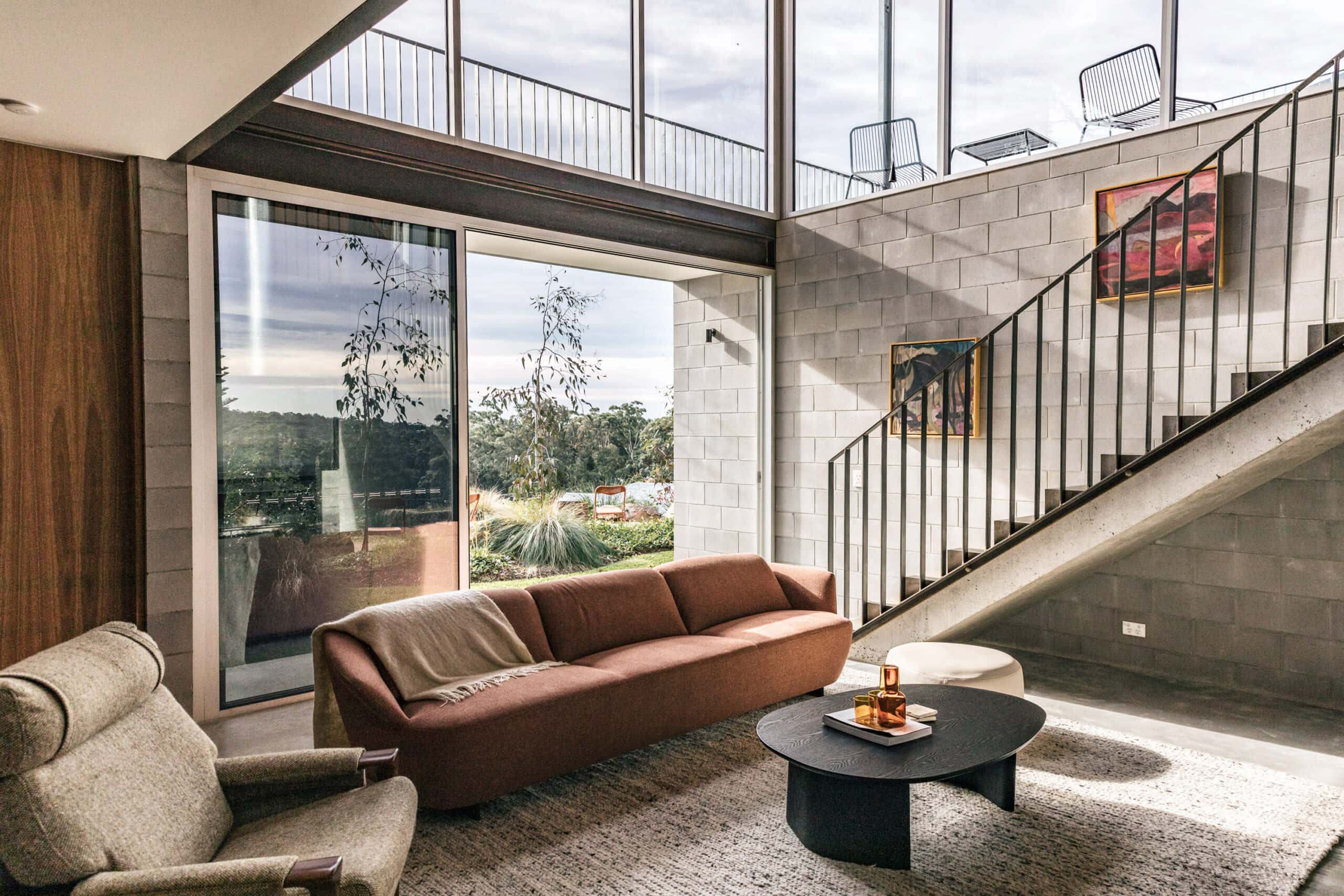 The earthy and textural material of concrete, original bridge beams from Tasmanian wharves and recycled Oregon rafters from war-time Canadian boats is used to soften the architecture of the home and draw focus to the leafy surrounds.