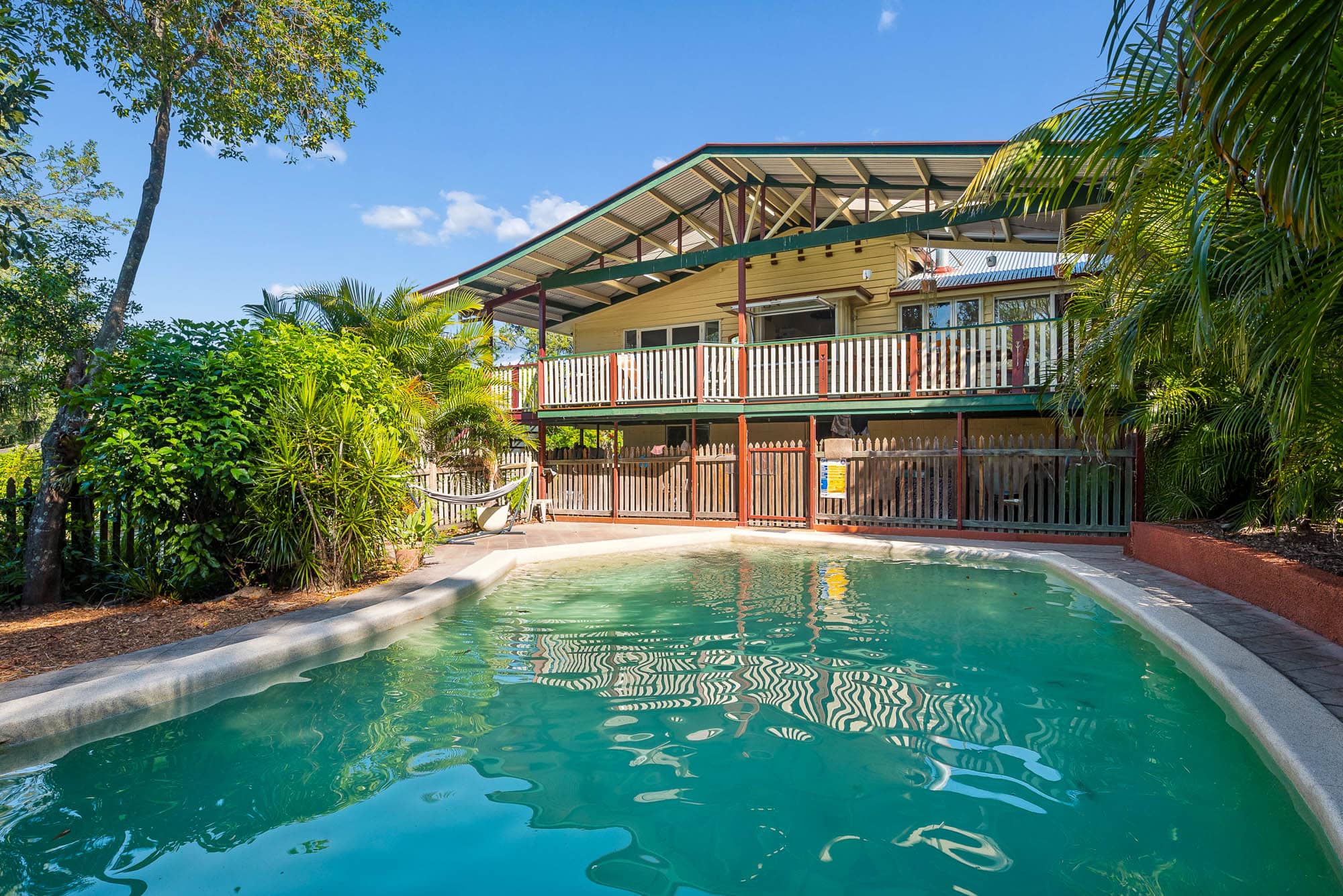 The kitchen is a highlight, featuring hardwood benchtops, gas cooktop, and an oversized gas strut servery window which opens on to the back deck and overlooks the inground pool.
