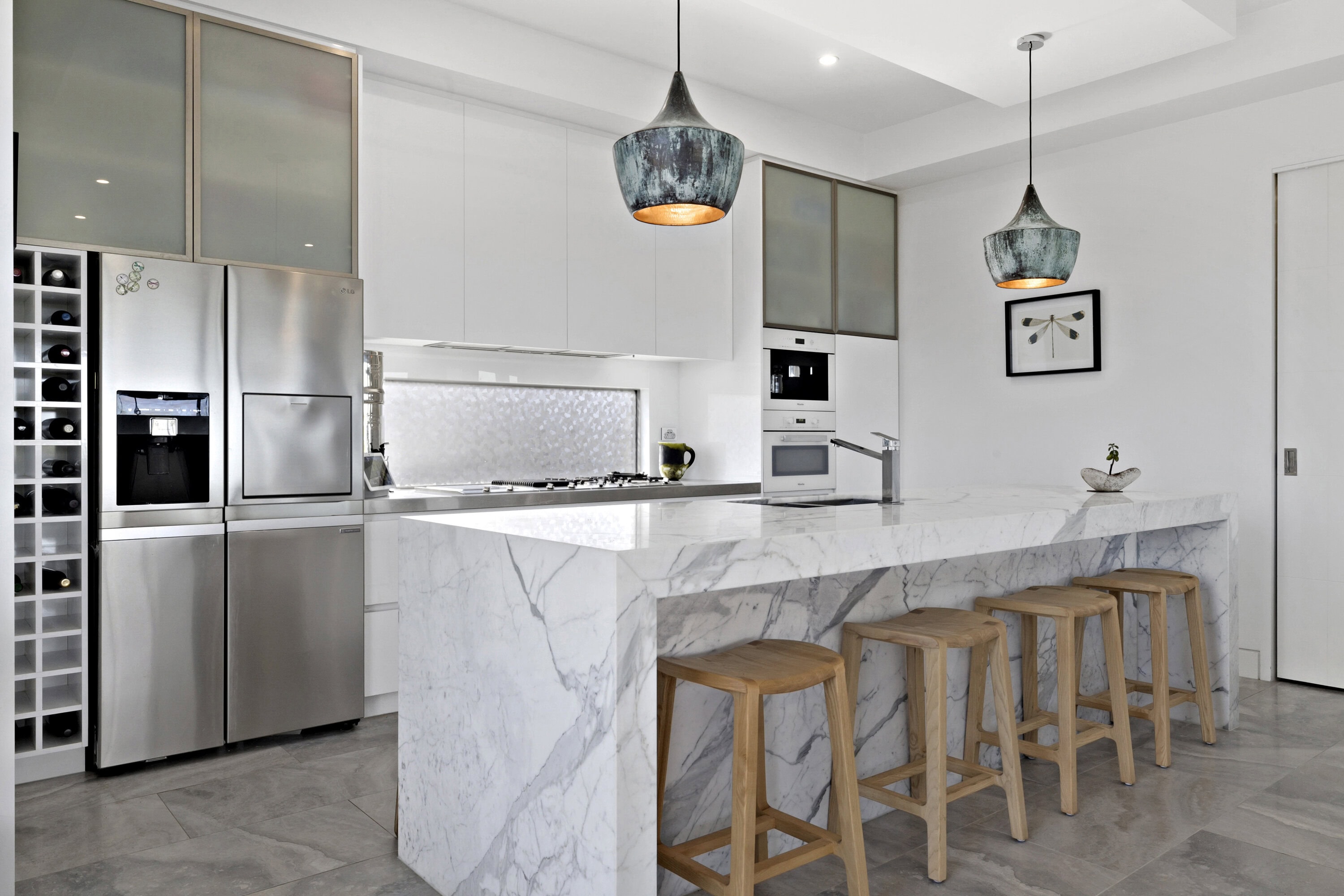 Flooded with natural light, the three-bedroom design offers an inviting ground-level space for entertaining, with leafy garden vistas establishing a harmonious link to the outdoors throughout the lounge, dining, and meals area. A bold stone benchtop brings added drama to the kitchen, while a fun colour palette upstairs plays with the home’s coastal surroundings.