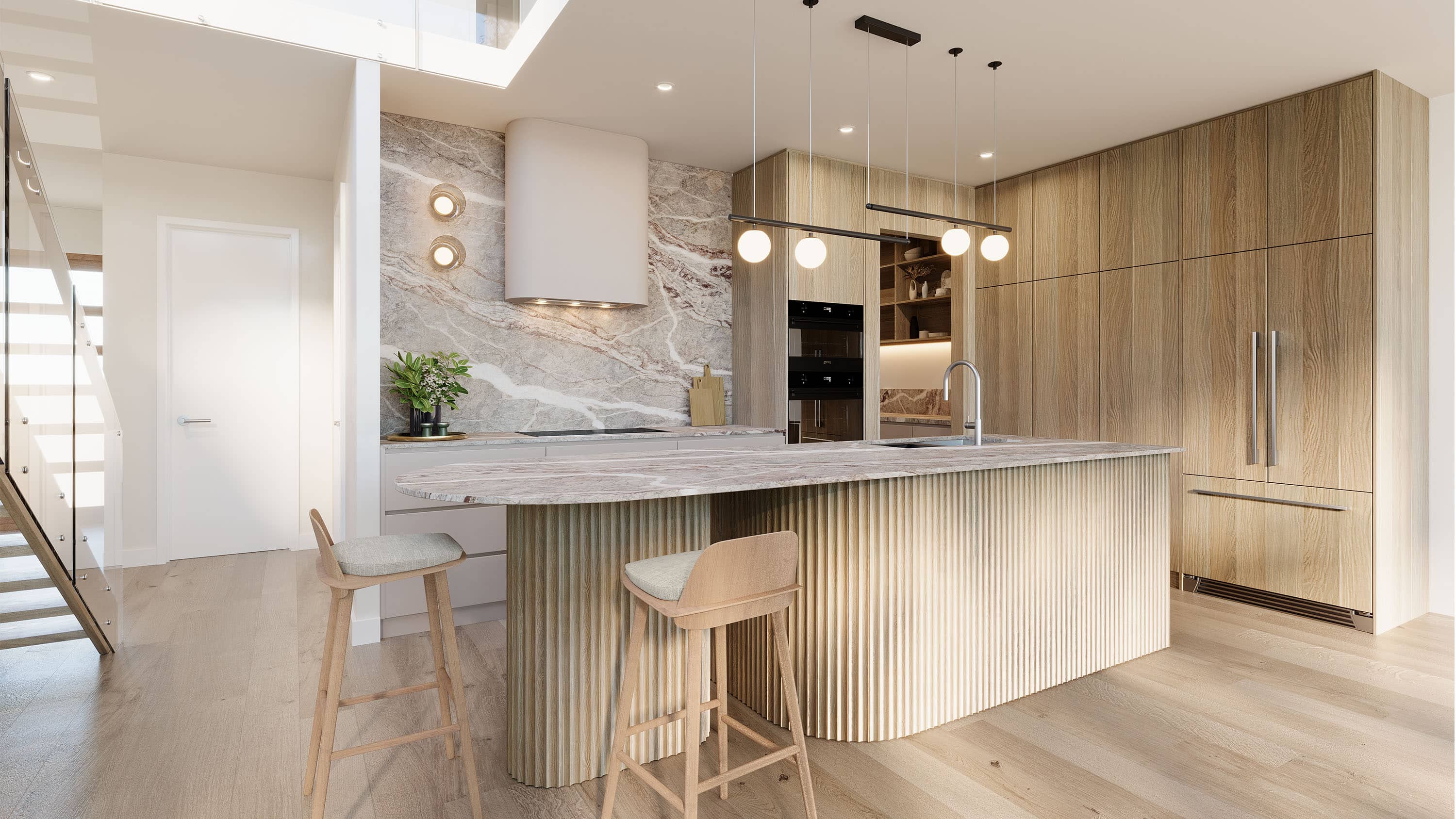 • Modern gourmet kitchen and butler’s pantry with high-end appliances, stone bench tops, and ample storage cupboards and drawers