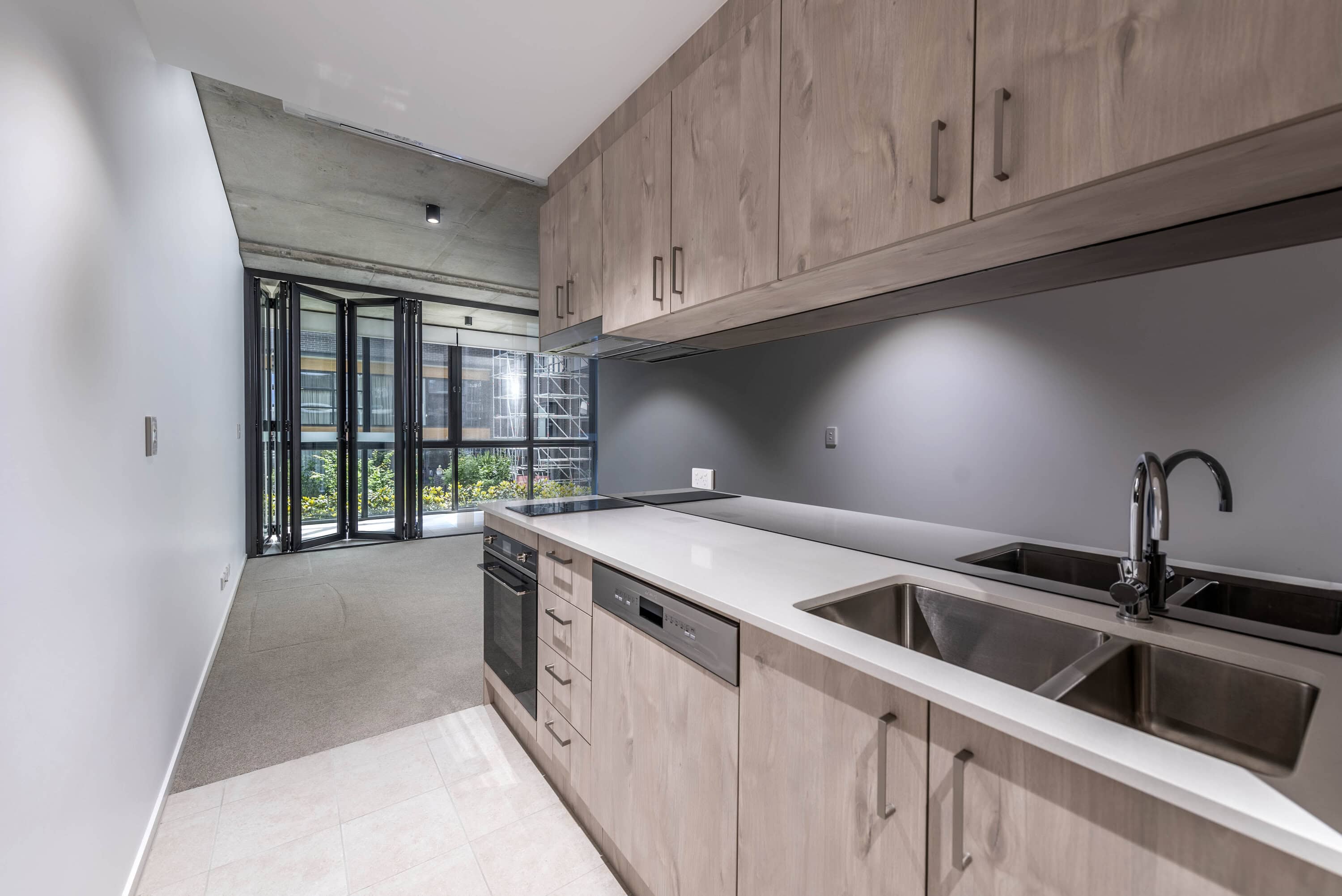 * Open-plan living with engineered timber floors and floor-to-ceiling glass
