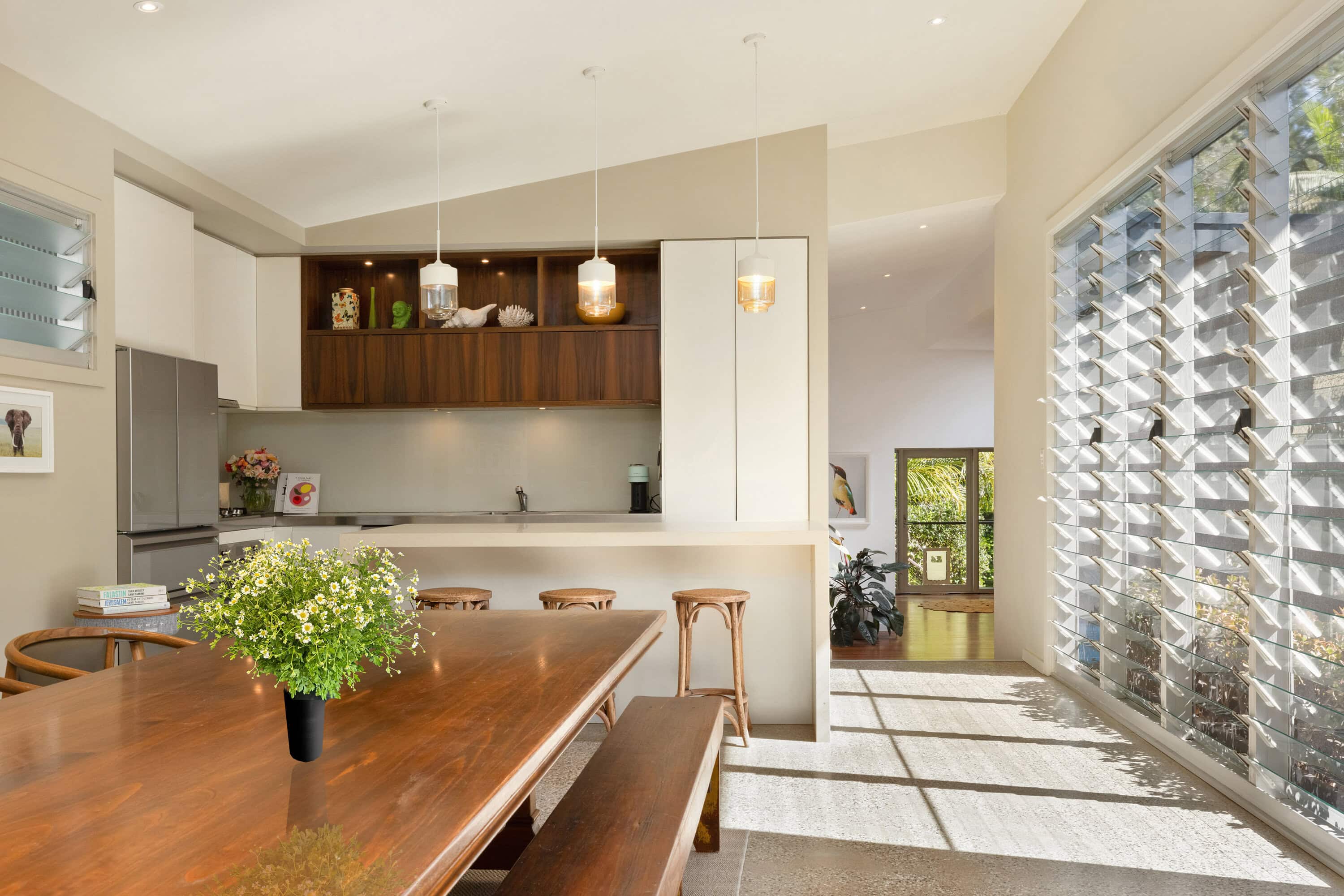 – Kitchen with solid timber joinery and adjoining casual meals area