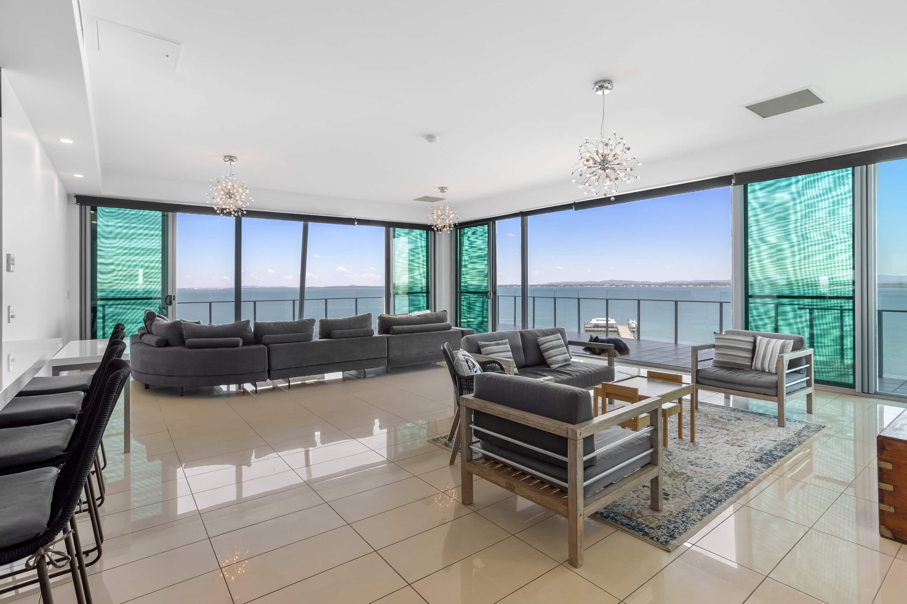 Spacious open-plan living & dining area with floor-to-ceiling glass sliders capturing uninterrupted ocean and city views