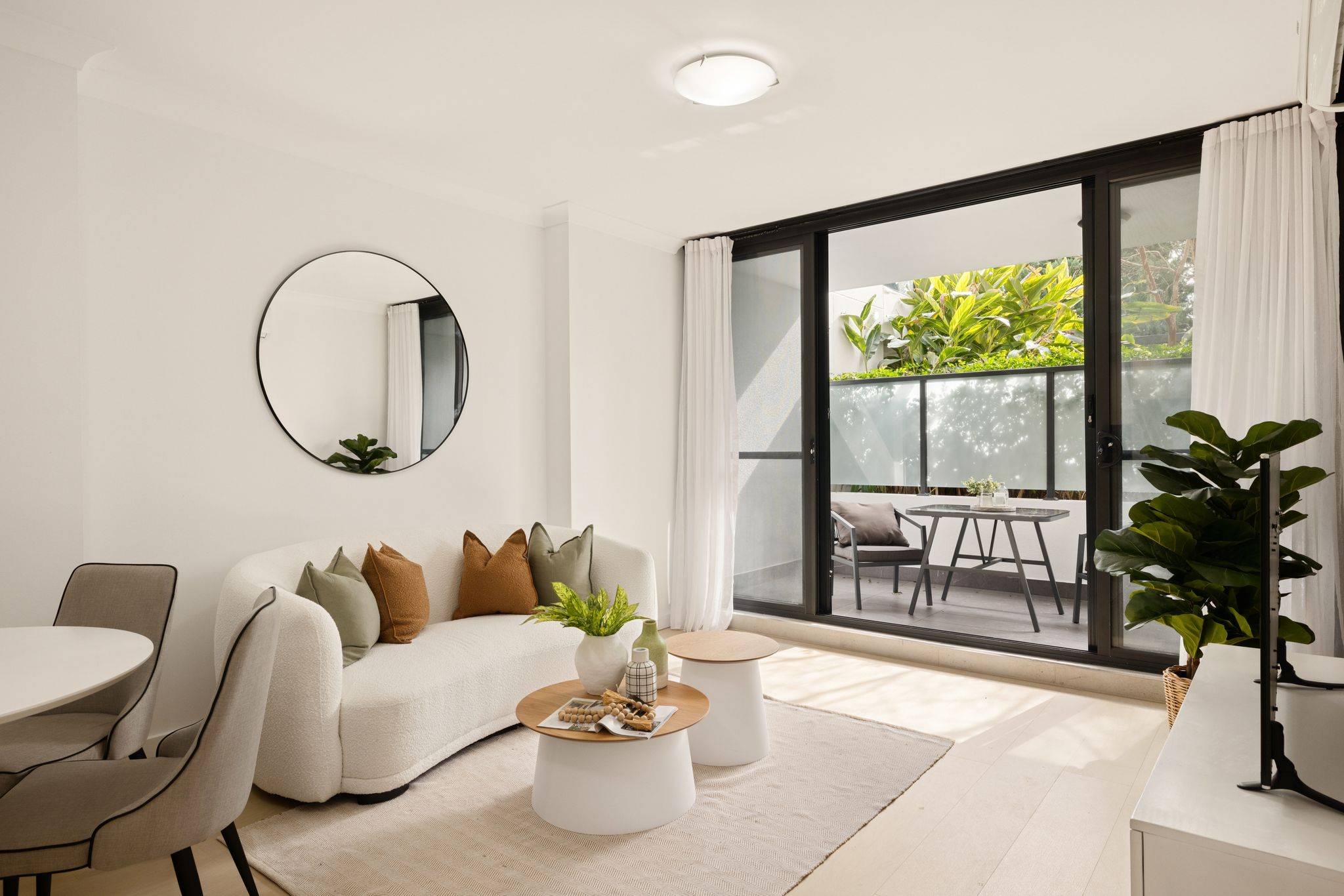 – Central lounge/dining space enjoys a scenic backdrop out to Sydney city