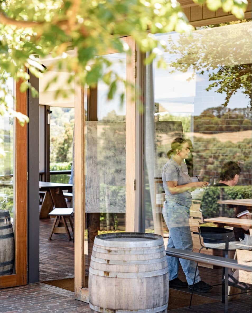 High in Main Ridge, the Peninsula’s loftiest vineyard offers a serene escape shaped by John and Julie Trueman’s quiet devotion. At Myrtacae, Chardonnay, Pinot Noir and Rosé are grown, hand-tended, and bottled on site, each sip a reflection of cool-climate elegance. The cellar door is intimate and artful, its signature “rolling tasting” using Riedel glassware to draw out delicate aromas. Surrounded by flourishing gardens and views that tumble into valleys, Myrtaceae rewards those who veer off track with wines of precision, purity and grace.