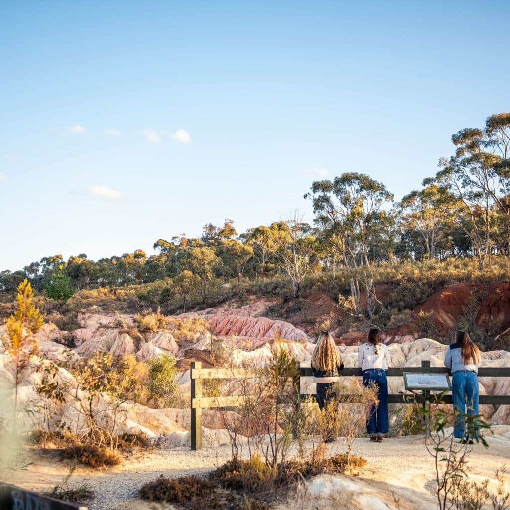 Heathcote-Graytown National Park is where Victoria’s Goldfields slip quietly into something more elemental. Stretching across box-ironbark forest and rocky ridgelines, it’s a landscape laced with old mine relics, spring wildflowers and far-reaching views from Mount Ida. The real showstopper sits just beyond the treeline — the Pink Cliffs, a surreal sweep of rose-and-ochre earth carved by gold-rush erosion. This contrast — rugged bush, soft blush tones and a deep sense of stillness — makes Heathcote-Graytown feel unlike anywhere else in the state.
