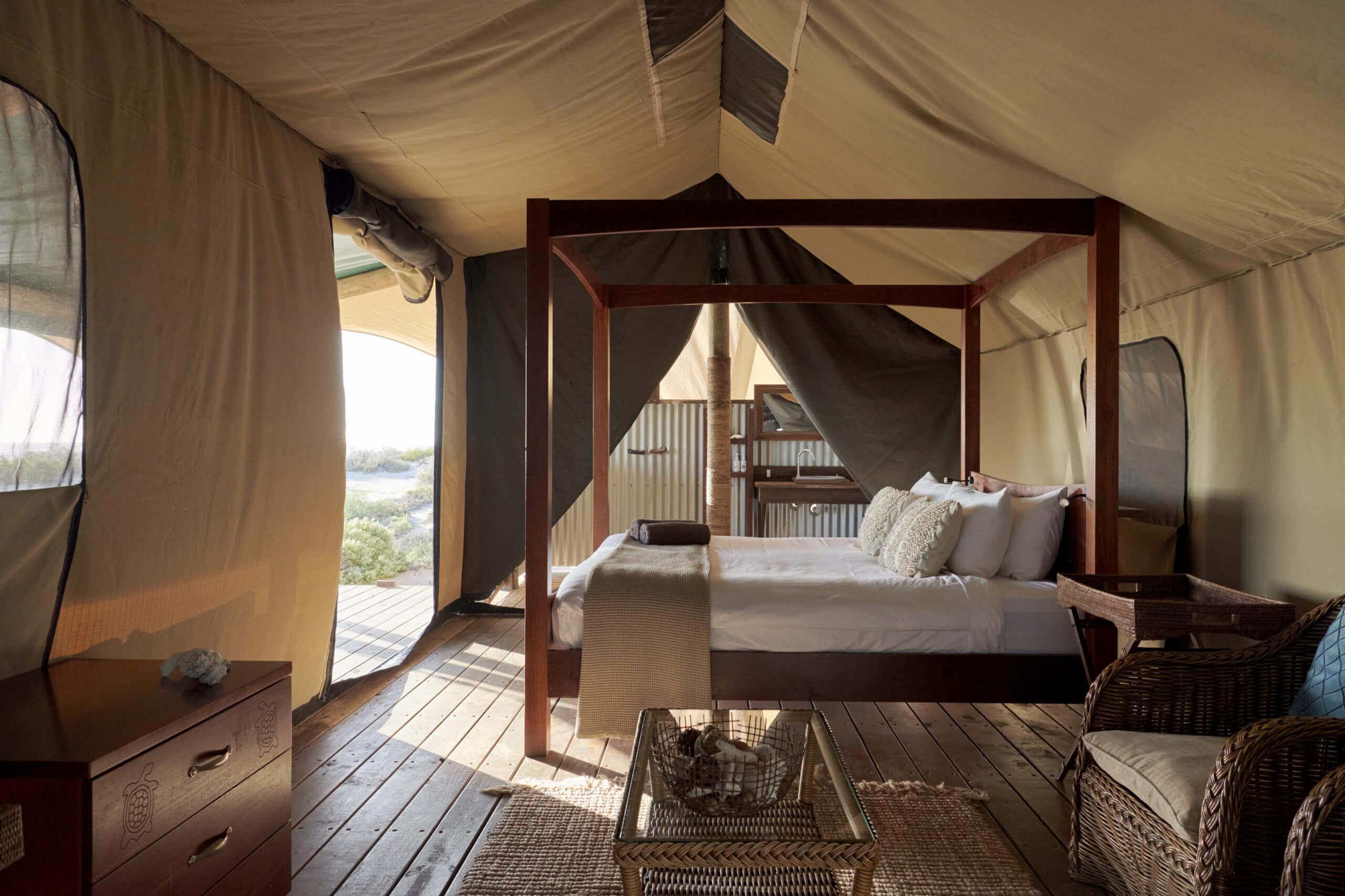 With just 16 off-the-grid luxurious safari tents camouflaged in the striking landscape, hammocks, decks, ensuites and handcrafted jarrah beds with crisp linens ensure a balance between nature and luxury where the outback meets the reef.