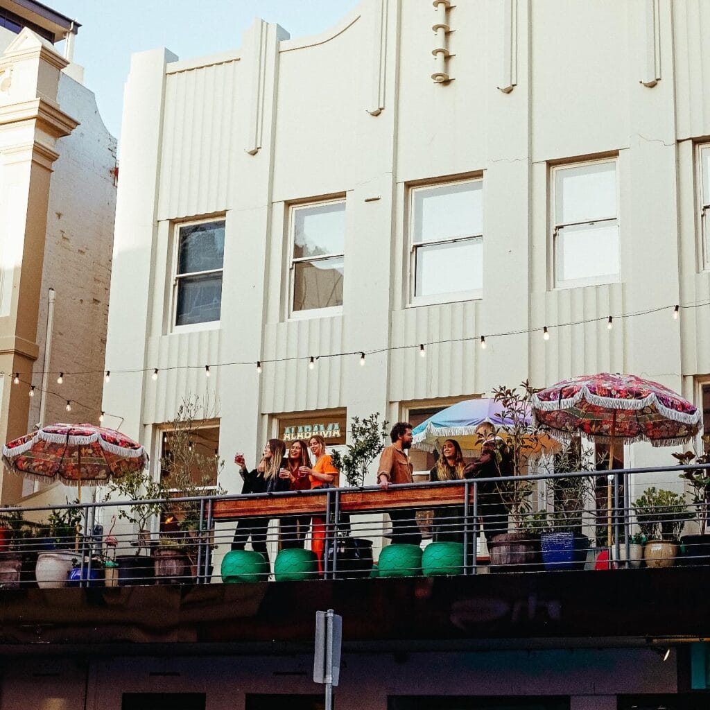 This is Hobart’s quirkiest boutique stay…with a hidden rooftop worth discovering. The Alabama’s leafy balcony bar trades in whimsy rather than slick skyline polish — vintage art, retro couches, potted greenery and the occasional house dog padding past. Order a spritz, a Tassie wine or something cold on tap, and settle into a rooftop bar in Hobart that feels more like a friend’s eclectic garden party than a hotel bar.