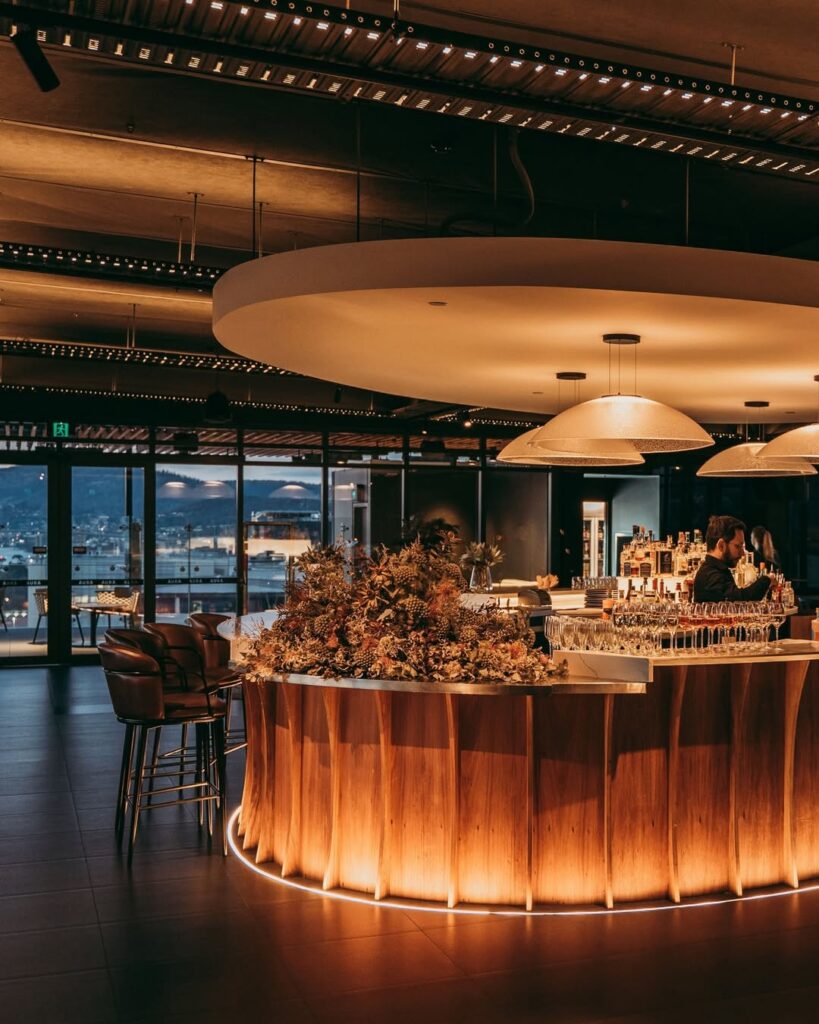 Crowning the top floor of the Crowne Plaza, AURA is a must-visit rooftop bar in Hobart — airy and sunlit by day, moody and magnetic by night. The sleek, industrial fit-out frames sweeping views, while the kitchen champions Tasmania on every plate. Think briny-fresh oysters, smoked rainbow trout and tender Northwest lamb chops, all designed for sharing over a bottle of local pinot. Cocktails are equally show-stopping — don’t miss the Flora Dora, a bright, raspberry-gin concoction with falernum, lime and ginger ale that’s as playful as it is refreshing.
