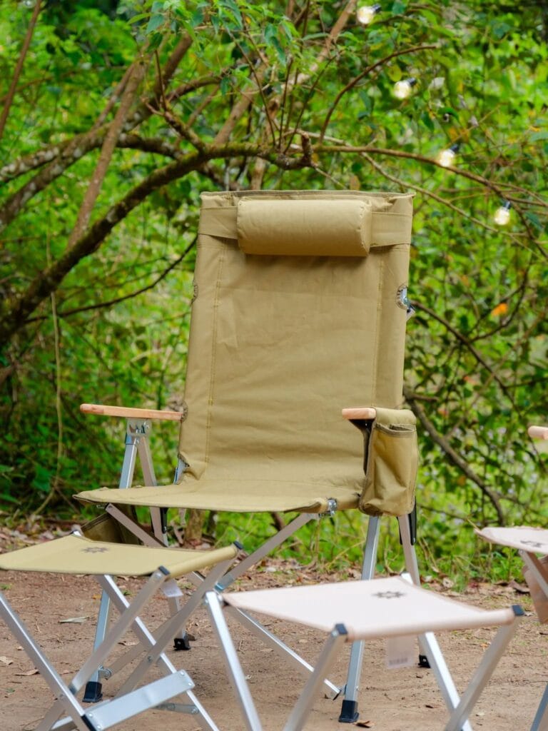 Camp seating, but cute. This camp chair and matching foot stool bundle is lightweight, comfortable and functional.